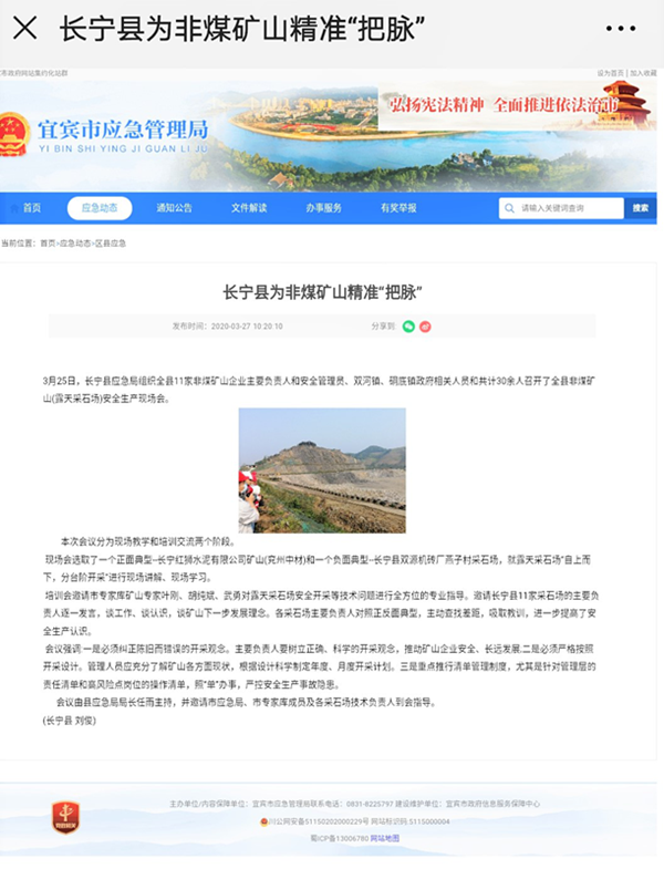 3月25日,宜賓市長(zhǎng)寧縣應(yīng)急局組織全縣11家非煤礦山企業(yè)負(fù)責(zé)人和安全管理員、雙河鎮(zhèn)以及硐底鎮(zhèn)政府相關(guān)人員共計(jì)30余人召開了全縣非煤礦山(露天采石場(chǎng))安全生產(chǎn)現(xiàn)場(chǎng)會(huì)。 長(zhǎng)寧縣應(yīng)急局邀請(qǐng)兗州中材長(zhǎng)寧分公司作為全縣非煤礦山的正面典型為參會(huì)企業(yè)分享開采經(jīng)驗(yàn)。 上午9點(diǎn)參會(huì)人員到達(dá)長(zhǎng)寧分公司―紅獅水泥礦山現(xiàn)場(chǎng),分公司員工與業(yè)主接待了到場(chǎng)的市縣領(lǐng)導(dǎo)以及企業(yè)參會(huì)人員。同時(shí)嚴(yán)格按照防疫要求進(jìn)行體溫測(cè)量,人員信息登記入場(chǎng)。   9:30分全部人員到齊,由長(zhǎng)寧分公司職工帶領(lǐng)大家參觀礦山現(xiàn)場(chǎng),為參觀人員介紹礦山整體情況,相關(guān)開采技術(shù),并解答參觀人員提出的問題。    10:30參觀結(jié)束,參觀人員對(duì)于此行都感到滿意,我們的礦山工作也得到了大家的認(rèn)可,相關(guān)同仁們都紛紛表達(dá)此行收獲甚多。 現(xiàn)場(chǎng)參觀學(xué)習(xí)結(jié)束后,當(dāng)天下午召開了室內(nèi)培訓(xùn)會(huì),培訓(xùn)會(huì)邀請(qǐng)了市專家?guī)鞂<遥瑫r(shí)長(zhǎng)寧分公司職工葉剛同志很榮幸在受邀之列。 針對(duì)于非煤礦山安全開采等技術(shù)問題,兗州中材長(zhǎng)寧分公司作為正面企業(yè)給參會(huì)企業(yè)分享了好的經(jīng)驗(yàn),同時(shí)也從會(huì)議中汲取了其他好的經(jīng)驗(yàn)方法。 3月27日,宜賓市應(yīng)急管理局報(bào)道了此次會(huì)議。此次會(huì)議中市縣領(lǐng)導(dǎo)高度評(píng)價(jià)了兗州中材長(zhǎng)寧分公司的礦山開采工作,同時(shí)被市縣領(lǐng)導(dǎo)評(píng)為正面典型我司感到很榮幸。在此后的工作中我們要更努力,爭(zhēng)取更大的進(jìn)步,樹立好我們的企業(yè)形象。 |