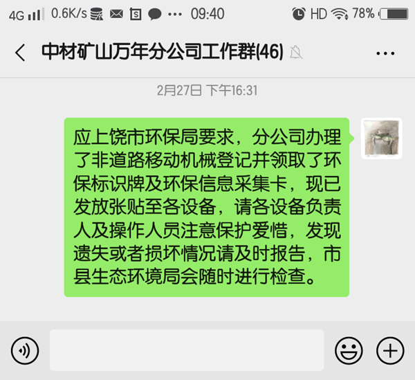 萬年分公司現(xiàn)有28臺(tái)套設(shè)備需要登記取證,經(jīng)過管理人員不懈努力,采集工作順利完成,經(jīng)市、縣環(huán)保部門的審核,分公司于2020年2月在萬年縣生態(tài)環(huán)境局領(lǐng)取非道路移動(dòng)機(jī)械環(huán)保信息標(biāo)示牌及環(huán)保信息采集卡。