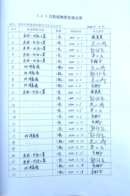 二、建立疫情防控領導小組,確保復工復產安全有序 分公司成立疫情防控領導小組,分公司經理任組長,組員由已到崗的全體員工組成。領導小組嚴格按照當地政府要求,嚴格落實疫情期間的消殺管控及登記制度,并與當地村委會合業主加強溝通,將感染風險降至最低。 三、多途徑購買防疫物資,確保防疫物資供應 寶豐分公司復工復產前,針對防疫物資緊缺的情況,一方面請求業主代為購買防疫物資,另一方面請求總公司代為購買。截止2月25日寶豐分公司已購買口罩900個,84消毒液90kg,防護服8套,護目鏡8套,酒精5kg,紅外線電子額溫槍1部,水銀體溫計10個;防疫物資準備充足,滿足1個月用量。  四、嚴格落實防控措施 (1)開展環境整治。對辦公場所及生產場所進行衛生清理;對空調進行清理洗。 (2)滅菌殺毒。每日2次對辦公場所及生產場所進行消毒處理,上午7:30至8:00,下午17:30至18:00。