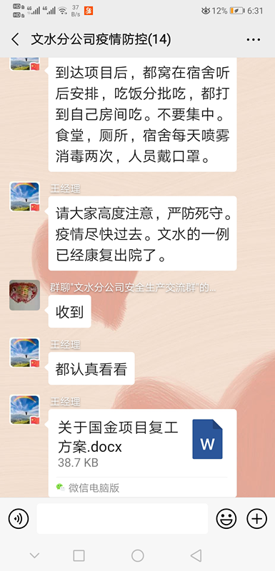 ---------文水分公司防疫防控工作 自新型冠狀病毒疫情爆發出現,公司領導高度重視,為確保項目部能夠順利復工,以及職工能夠安全度過疫情期,文水分公司做了以下工作: 1、由王建立經理統一領導,分公司人員負責成立疫情防控小組,制定復工方案協助業主開展防疫工作。新型冠狀病毒感染的肺炎疫情防控工作的處置由疫情防控工作領導小組統一領導,全體人員無條件服從領導小組的指揮調度。以職工根本利益為出發點和落腳點,依照法律法規和政策辦事,防止因處置不當而造成疫情蔓延事件發生。