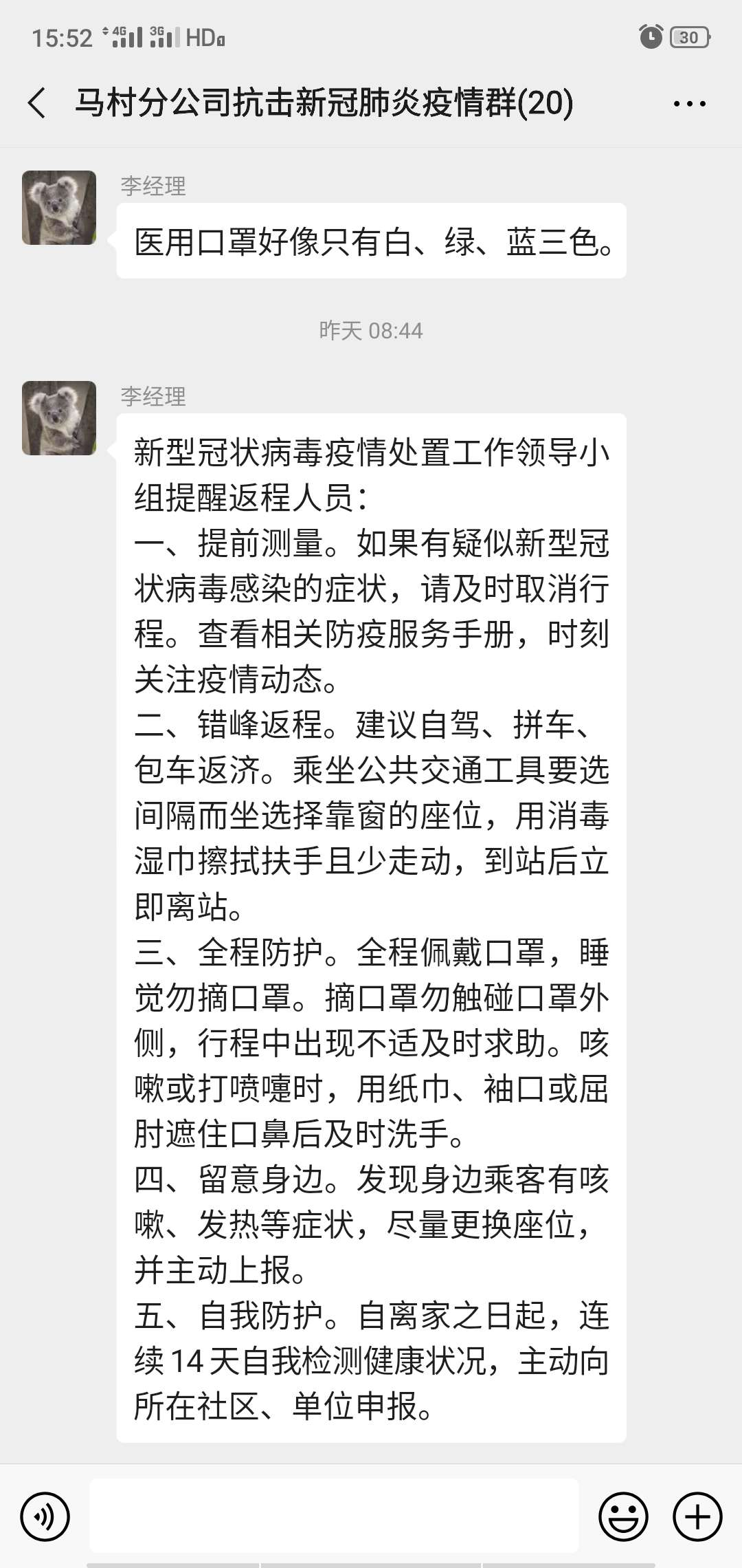 為有效控制疫情的傳播,針對疫情期間的各項工作安排,兗州中材馬村分公司于2020129日成立應對疫情工作領導小組。根據省委、省政府及公司關于做好疫情防控的重大決策部署,全面落實分公司的相關工作要求,負責與分公司上級及地方、千業水泥疫情工作的聯系,協調好疫情期間的人員以及各項工作安排。