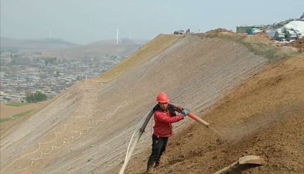 2019年4月5日當天噴播工作全面展開。選用的噴植植物由紫翠槐、胡枝子、荊條、多花木蘭、鹽膚木、刺槐等十幾種灌木及狗尾草、沙棘、苜蓿等十幾種草本植物組成,混合壤土進行噴植。