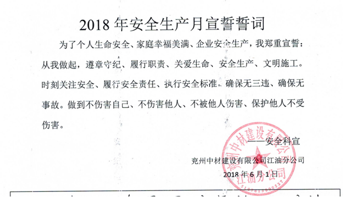 會上,安全科傳達(dá)《2018年安全生產(chǎn)月活動實施方案》并對安全工作進(jìn)行闡述與部署。組織員工觀看安全教育宣傳片,通過對典型真實案例的生動再現(xiàn),使員工真正從思想深處懂得安全,重視安全,時時刻刻想著安全,增強(qiáng)職工安全意識,強(qiáng)化安全理念,提高職工的安全素質(zhì)。項目副經(jīng)理強(qiáng)調(diào),安全是社會經(jīng)濟(jì)發(fā)展的需要,是企業(yè)自身發(fā)展的需要,是從業(yè)人員參與勞動的需要。要樹立“紅線意識”,堅決落實崗位責(zé)任;加強(qiáng)安全教育宣傳,定期排查隱患,完善安全體制建設(shè),依法治安、依法作業(yè);堅持“安全第一、預(yù)防為主、綜合治理”的方針,持續(xù)有效推動公司安全生產(chǎn)形勢穩(wěn)定發(fā)展。項目經(jīng)理要求,一是要加強(qiáng)領(lǐng)導(dǎo)、高度重視,正確把握當(dāng)前安全形勢,突出落實安全責(zé)任主線,深刻認(rèn)識開展“安全生產(chǎn)月”活動的重要意義;二是要圍繞主題、協(xié)調(diào)推進(jìn),大力宣傳黨和國家的安全生產(chǎn)方針政策、法律法規(guī),通過開展一系列安全活動,進(jìn)一步營造“關(guān)愛生命、關(guān)注安全”的安全氛圍;三是要扎實開展、狠抓落實,以“安全生產(chǎn)月”活動為契機(jī),在保持雙體系有效運(yùn)行的同時做到統(tǒng)一思想、提高安全意識,為公司安全穩(wěn)定、和諧發(fā)展提供有力保障;四是要強(qiáng)化培訓(xùn)、提升意識,圍繞國家法律法規(guī),開展員工安全教育培訓(xùn),全面提升全員綜合安全素質(zhì)及法制意識,強(qiáng)化依法治企、依規(guī)治企。會議最后,項目部組織全體員工進(jìn)行安全月宣誓和簽名,安全生產(chǎn)月正式拉開帷幕。