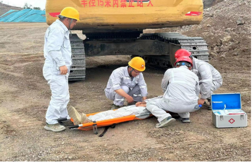 本次演練主要模擬515平臺(tái)發(fā)生車(chē)輛傷害事故,一名員工被挖機(jī)回轉(zhuǎn)時(shí)碰傷倒地,頭部撞擊受傷,傷情嚴(yán)重,進(jìn)行緊急救援的情景。