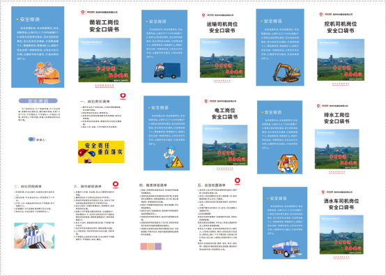 口袋書封面背頁以安全為主題,與生產(chǎn)相結(jié)合,內(nèi)容包括安全文化標(biāo)語、口號(hào)、個(gè)人安全承諾、具體崗位職責(zé)要求、風(fēng)險(xiǎn)辨識(shí)、操作規(guī)范、隱患排查、應(yīng)急處置等。